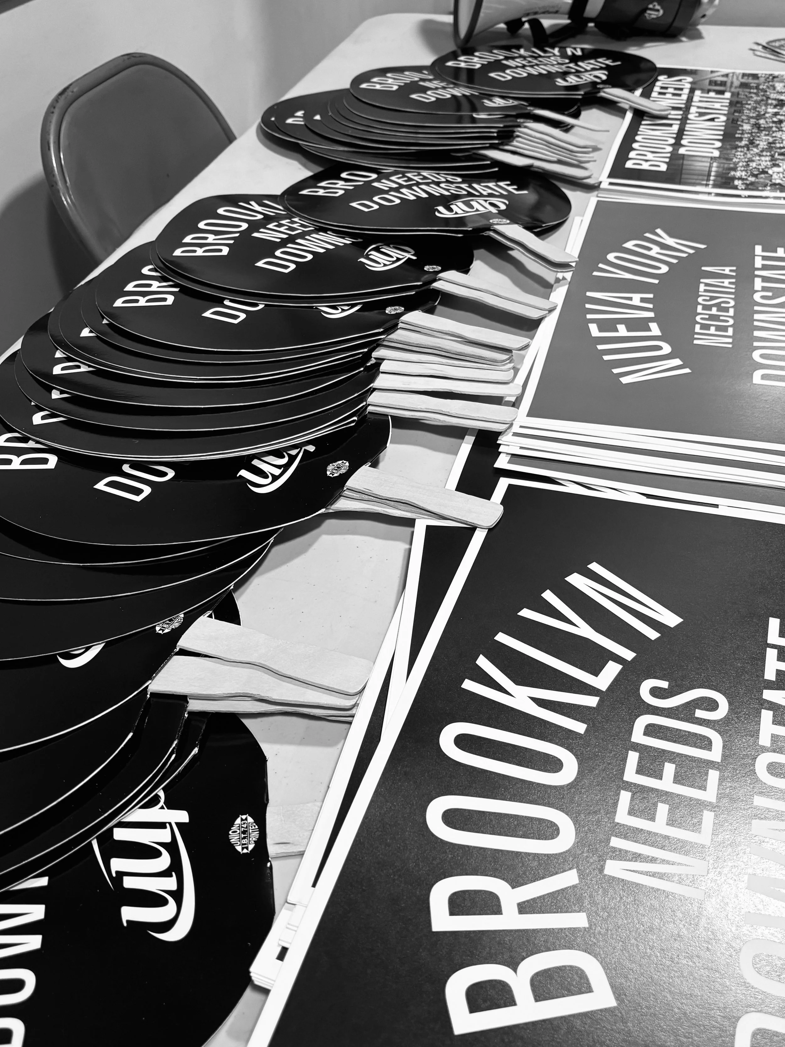 Group of people protesting on the street, holding signs that read 'Brooklyn Needs Downstate.'