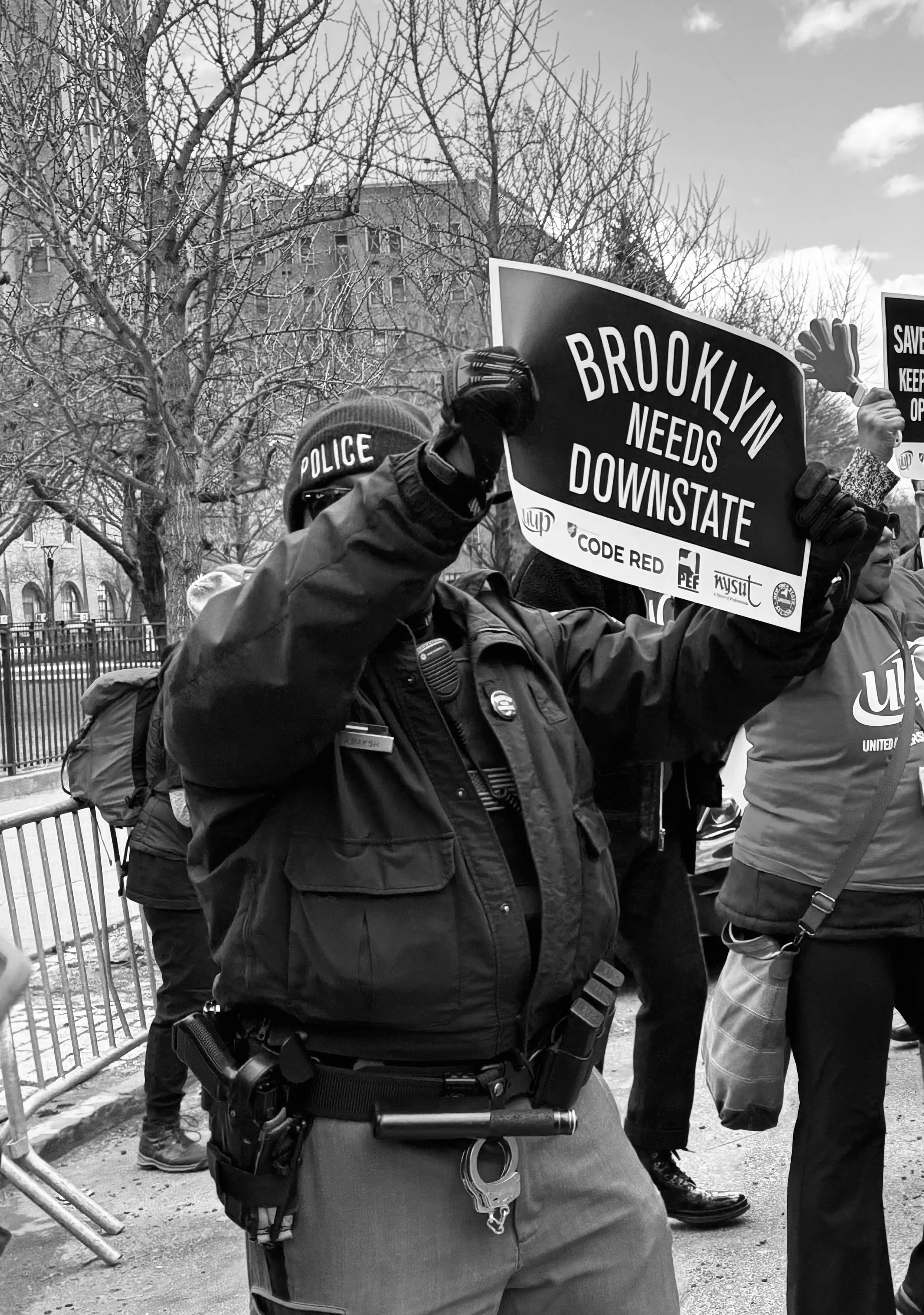 A police officer holding a sign that reads 'Brooklyn Needs Downstate' during a protest. The officer is wearing a beanie labeled 'POLICE' and a dark jacket, with other protesters and leafless trees in the background.