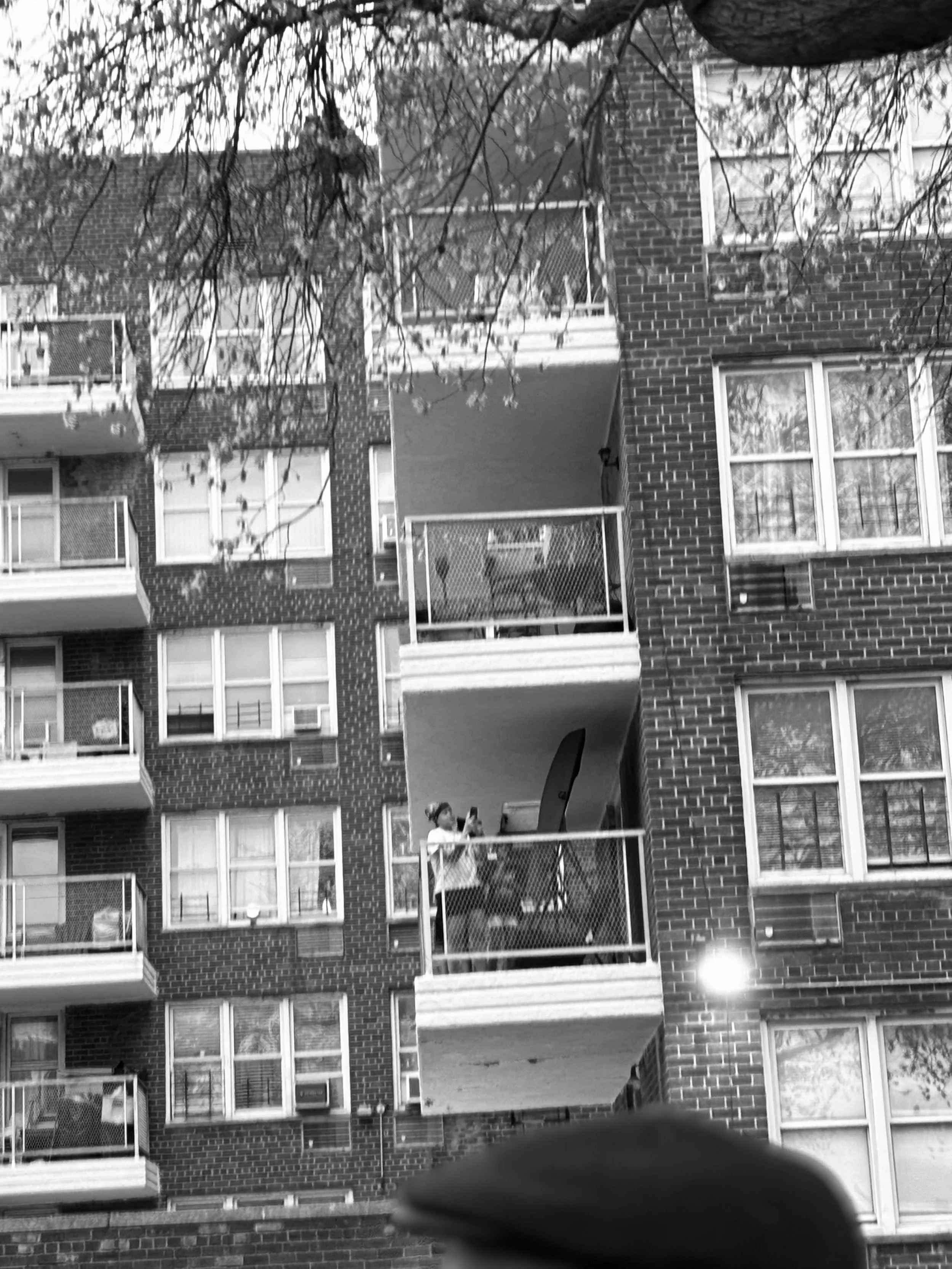 A woman on a balcony at an apartment complex taking a photo or video on her phone, with trees in the foreground.