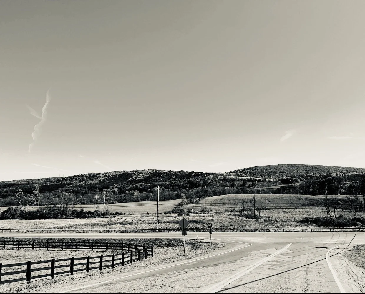Black and white photo of a rural landscape featuring rolling hills, a winding road, a stop sign, and fence near the road.