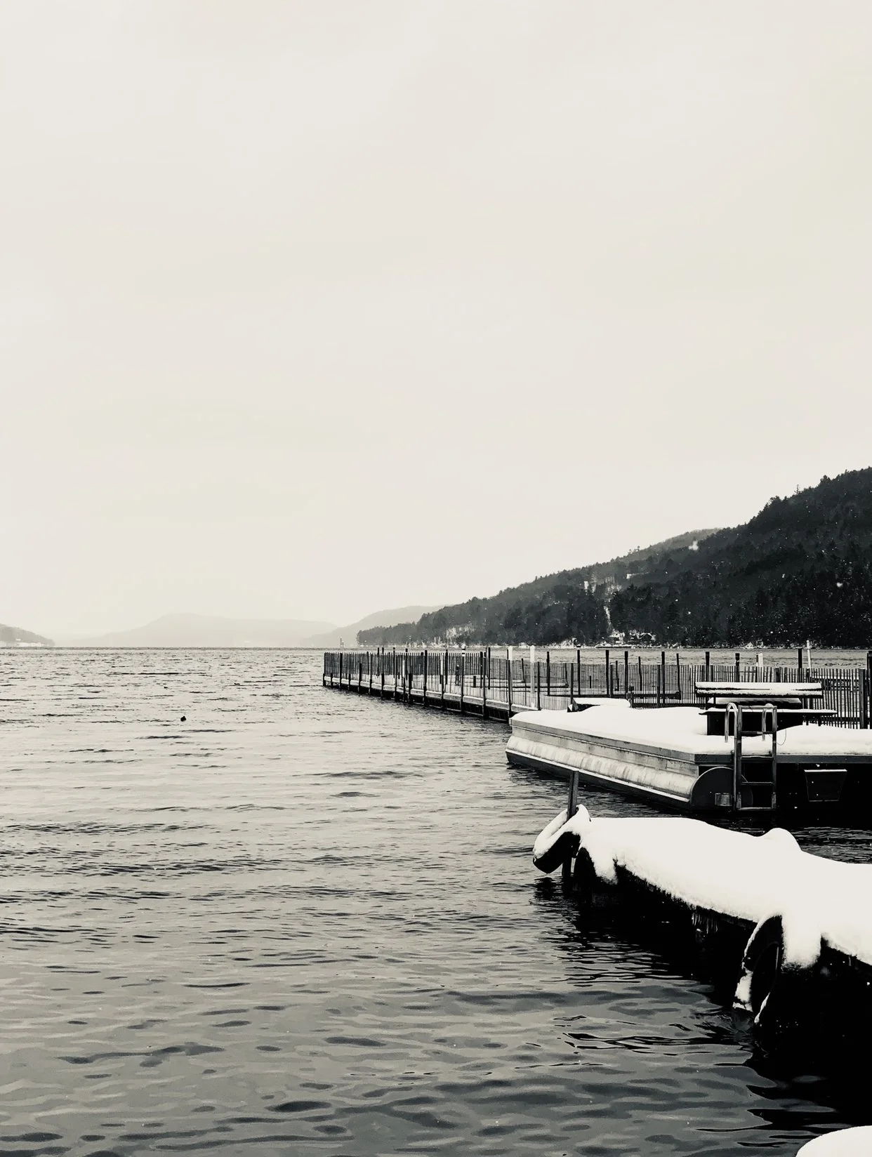 A snow-covered dock extends into a calm lake with hills in the background, captured in black and white.
